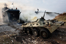 Armored personnel carriers with Marines come ashore on Cape Klerk in Peter the Great Bay during an amphibious landing as part of tactical exercises on the Klerk military range with air assault units, Pacific Fleet ships, army and attack aircraft of the Eastern Military District. Source: Vitaliy Ankov/RIA Novosti