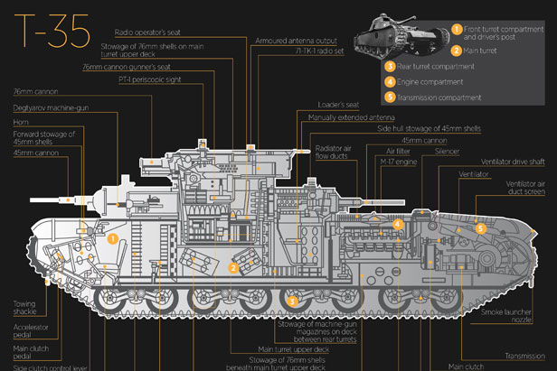 The T-35 tank was developed by the OKMO design bureau of the Bolshevik Factory in 1930. It was the only five-turreted heavy tank in the world to reach production.
