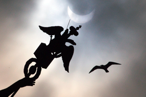 The moon blocks part of the sun during a solar eclipse as seen over a fragment of statue at the one of the city landmarks, the General Staff Headquarters in St.Petersburg, Russia. Source: AP